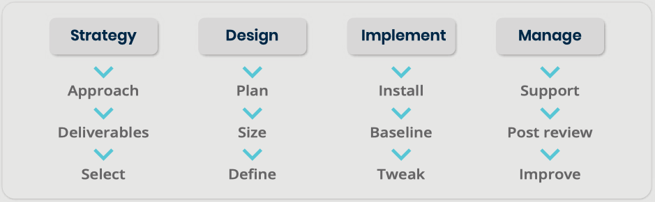 ThirdWaveICT utilizes a four-phased service delivery framework (strategy - design - implement - operate), which is based on industry best practices and designed to address end-to-end solution fulfilment needs.
